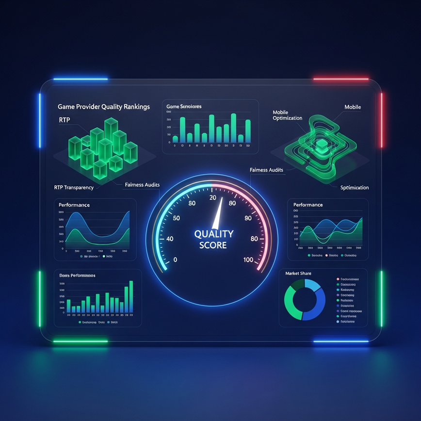Digital dashboard visualizing game provider quality rankings, showing charts for RTP, fairness, and mobile optimization, with abstract online slot and live dealer table elements in the background, conveying a high-tech and trustworthy online casino experience.