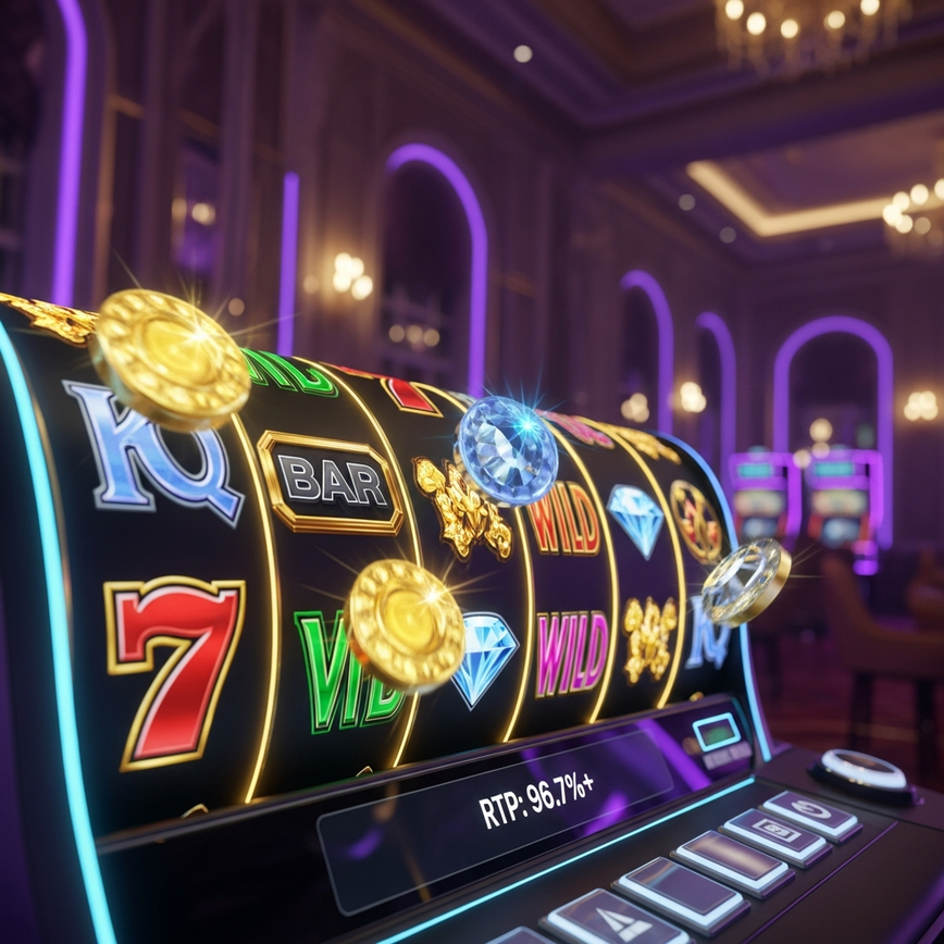 Vibrant online slot machine interface displaying spinning reels with high-value symbols and a prominent 96.5%+ RTP indicator, set against a luxurious online casino backdrop.