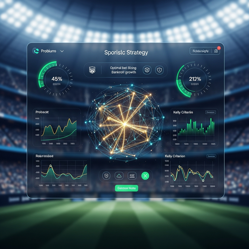 High-tech sports betting interface showing abstract data, optimal bet sizing, and bankroll growth strategy, representing the Kelly Criterion.